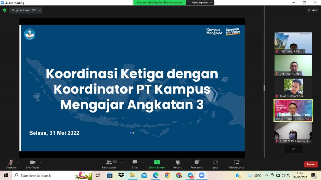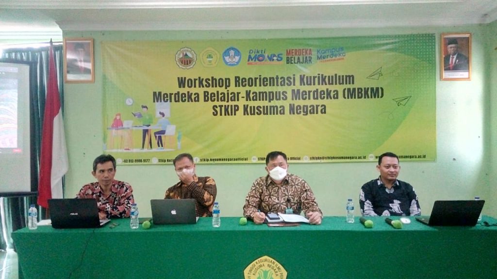 KURIKULUM MERDEKA BELAJAR KAMPUS MERDEKA STKIP Kusuma Negara melakukan reorientasi kurikulum pada bulan agustus 2022. Reorientasi kurikulum ini dilaksanaan dengan tujuan penyesuaian kurikulum STKIP Kusuma Negara dengan kondisi dan kebijakan pemerintah saat ini. Diharapka kurikulum hasil reorientasi kurikulum ini diharapkan selaras dengan program pemerintah khususnya program merdeka belajar yaitu hak mahasiswa untuk belajar 3 semester diluar prodi. Selain itu lulusan STKIP Kusuma Negara memiliki ketrampilan dan kopetensi yang sesaui dengan kebutuhan DUDI. Serangakian kegiatan reorientasi dilakukan diantaranya workshop penyusunan kurikulum. Wrokshop penyusunan kurikulum STKIP Kusuma Negara dilaksanakan pada tanggal 4 Agustus 2022, dibuka oleh Ketua STKIP Kusuma Negara, Dr. H. Herinto Sidik Iriansyah, M.Si. dan dihadiri oleh pejabat struktural STKIP Kusuma Negara dan tim penyusun kurikulum. Dalam kegiatan ini menghadirkan narasumber Dr. Sardulo Gembong, M.Pd. beliau adalah Dekan Universitas PGRI Maidun. Dalam paparanya narasumber menjelaskan bagaimana cara konversi kegiatan MBKM ke matakuliah setara 20 SKS. Ini menjadi ilmu penting yang harus dijadikan pertimbangan untuk menentukan CPL dari suatu matakuliah yang dapat dikonversi kegiatan MBKM. Sehingga nantinya kegiatan MBKM yang dikonversi ke mata kuliah yang memiliki CPL yang sesuai dengan kegiatan. Kegiatan workshop kurikulum STKIP Kusuma Negara ini dilaksanakan secara hybrid. Narasumber dan sebagian peserta melakukan kegiata melalui zoom metting dan sebagian lainnya berkumpul di Ruang Aula STKIP Kusuma Negara.